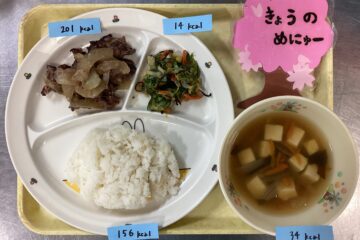 今日の給食は、ごはんと豚肉と大根の味噌煮と小松菜のナムルです。