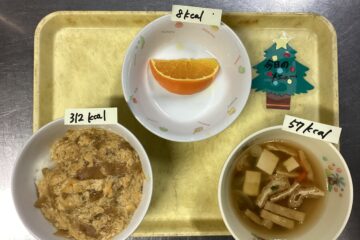 今日の給食はご飯と、タンドリーチキンとオクラのおかか和えと豆腐とわかめのスープです。
