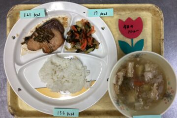 今日の給食はごはん・ポークピカタ・もやしの甘酢和え・椎茸とキャベツのスープです。