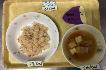今日の給食はごはんとポークピカタと中華風サラダと青菜のすまし汁です。