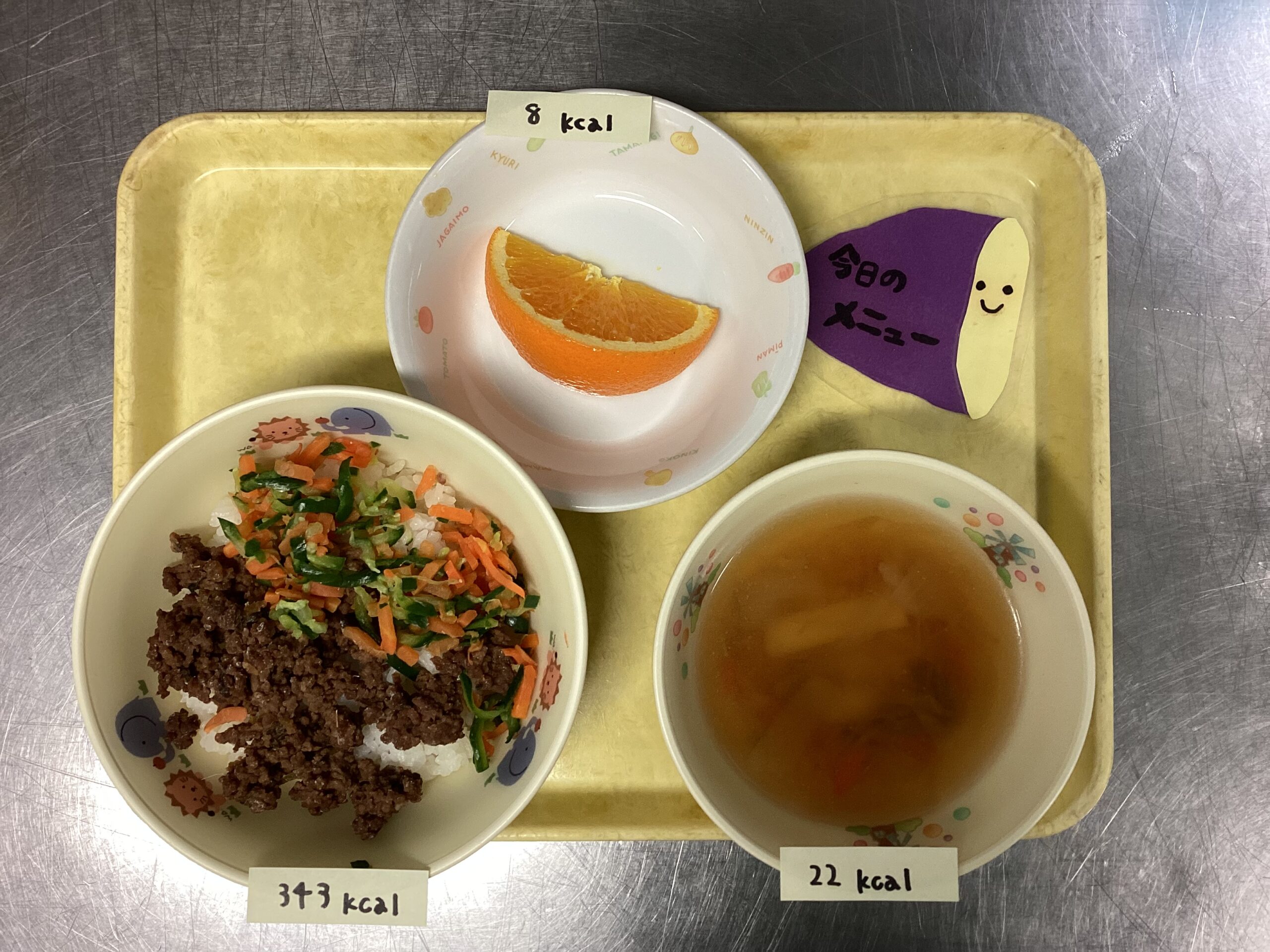三色丼・千切りスープ・オレンジ