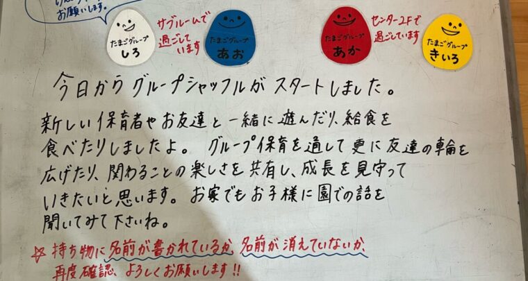 3月15日(火) 《乳児組 たまごグループ》 今日から新しいグループでの生活が始まります!登園時はドキドキした表情が見られましたが 活動が始まると、満面の笑顔で新しい保育者やお友達との関わりを楽しんでいましたよ! 「みんなは何グループかな?」と聞くと、「赤グループ!」「青グループ!」「○○先生!」と 自信たっぷりに教えてくれました。ぜひ、お家でもグループのお話を聞いてみてくださいね。 設定内容→(ぴっこ