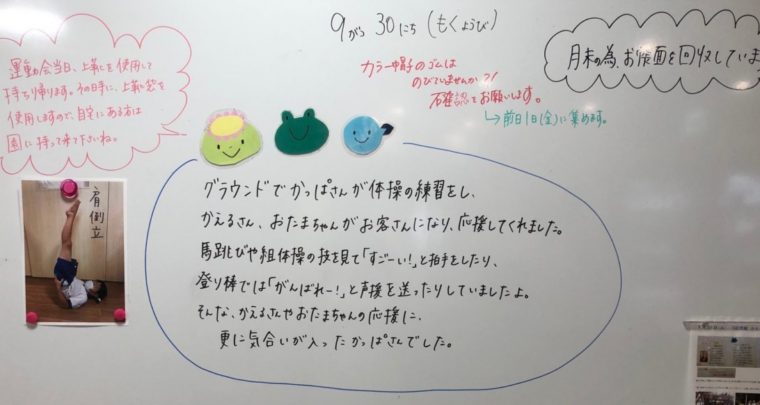 運動会の練習をして帰ってきたかっぱさんと、かえるさん。『やった~!!今日カレーや~!!』と喜んでいました。