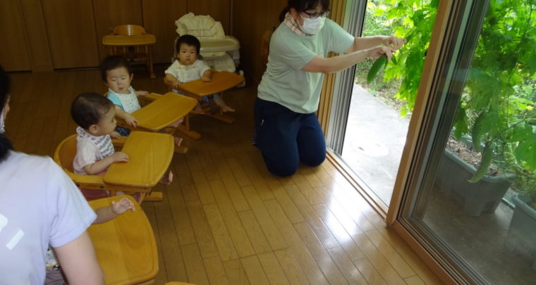 7月9日(金) 《乳児組 ぴっころ組》 ぴっころ菜園では野菜が毎日収穫できるようになりました。今日は子どもたちの前でゴーヤを収穫しました。 その他にもキュウリやミニトマト・オクラを収穫。 採りたての野菜を触りました。「あ~ん」と思わず口に運ぶ姿も見られました。 日中はアスレチックとボール遊びをしました。ボールプールは大人気でした。 保育者が声を掛けると、隣の部屋