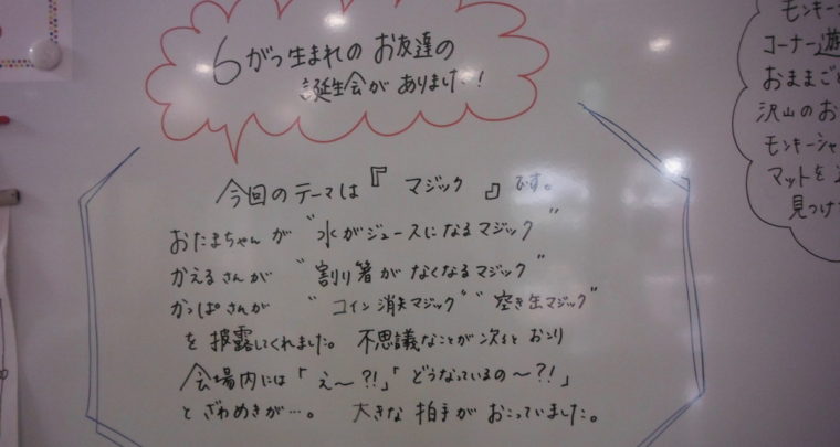 6月11日(金) 《幼児組》 今日は、6月生まれのお友達の誕生会がありました。かっぱさんによるオープニングのマーチングではじまり大盛り上がり!! おたまちゃんによるジュースマジック かえるさんによる石とび&おはしがなくなる!?マジック かっぱさんによるコインがきえるマジック ハンドパワー あっとおどろくしかけばかりで会場を楽しませてくれた6月生まれのお友達で