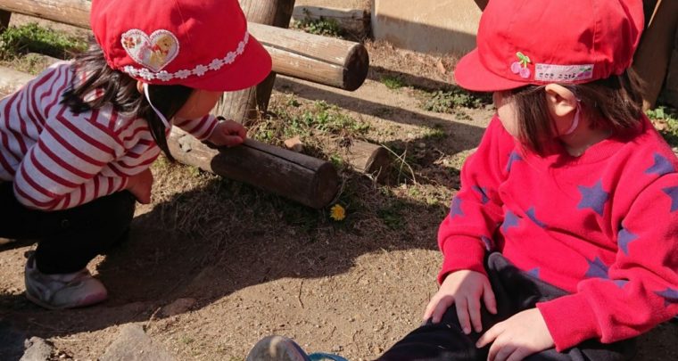 2月22日(月) 《乳児組 こぐま組》 チキチキ広場で遊びました。 歩いていると春の花を発見!「何のお花だと思う?」と聞くと、 「ひまわり!」というお友達もいましたが、「たんぽぽ」と言うと 「たんぽぽ」と言いながら優しく触ったり、見ていましたよ。 その後、みんなで回旋塔に乗ってみました。 砂場では、作ったお料理を隣へやってきたお友達に「どうぞ」と渡してあげていましたよ。 たくさん遊んだ