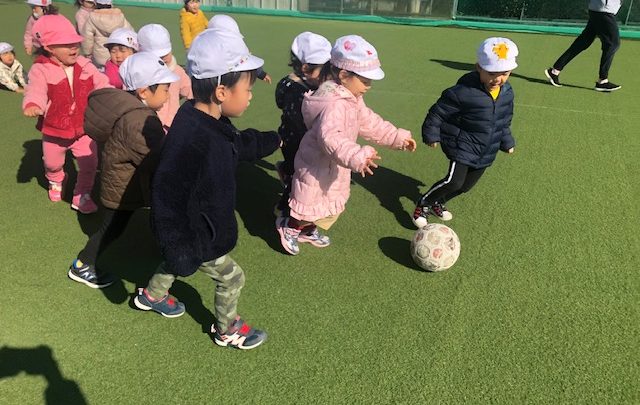 2月25日(木) 《乳児組 たまご黄グループ》 ポカポカ陽気でとても気持ちの良い日に元気いっぱいの子ども達は、 「お外行きたいな~」と話していたので、はだしっこ広場で遊びました。 サッカーボールを使って簡単なルールを守って遊びました。 ①足でけること。 ②手でボールを触らない。の2つのお約束を守ってサッカーをしてみることにしました。 真剣な表情でボールを追いかけ、手で捕まえたい気持ちをグッとこらえ必死になる
