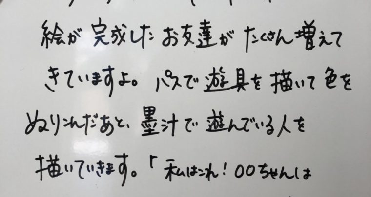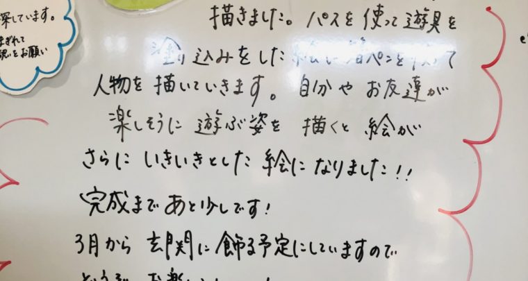 2月22日(月) 《幼児組 かっぱグループ》 今日は卒園製作のチキチキ広場、モンキーシャトーの絵を描きました。 何日かに分けて描いているのですが、完成間近の子ども達! 「できたー!」」と楽しそうです。著ペンで自分やお友達も描き入れました。 思い思いに描いた絵の中でもいきいきと遊ぶ子ども達です。 設定内容→(かっぱ)卒園製作 (かえる)和太鼓 (おたま)1組…チ