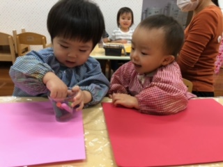2月15日(月) 《乳児組 こりす組》 今日は好きな画用紙とパスを選んでなぐり描きをしました。 お友達がパスを選んでいるのを見て「どれにしようかな?」と待ちきれない様子のこりすちゃん。 お友達と笑い合いながらなぐり描きを楽しんでいましたよ。 力強い線を描けるようになり、顔を描ける子もいました。 「パパ」「じぃじぃ」とたくさんおしゃべりしたり、もくもくと真剣な顔で取り組んだり、 それぞ
