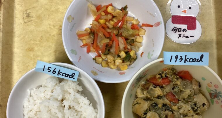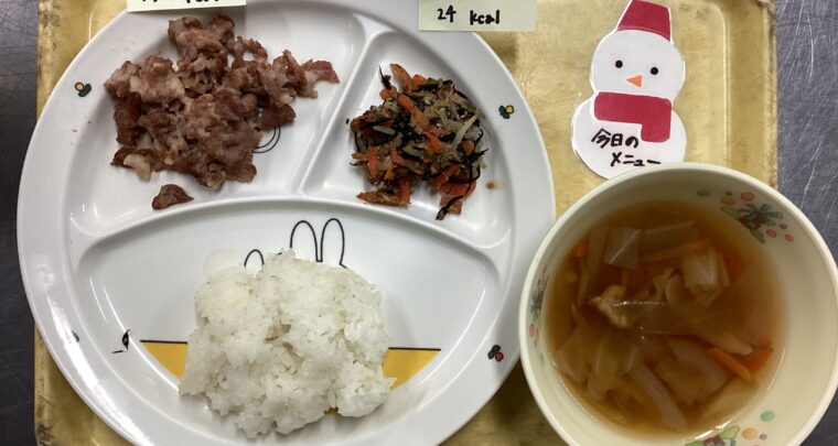 ごはん・豚肉の照り焼き・ひじきのごま酢和え・鶏肉とキャベツのスープ