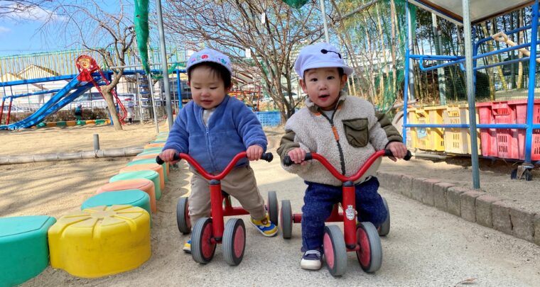 2月7日(金) 《乳児組 ひよこ組》 今日はチキチキ広場に遊びに行きました! 三輪車が大好きで到着すると「乗る!」と言って砂場のまわりをグルグル走ります! トロッコに乗っている友達を引っ張ったり 木の遊具でユラユラしたりと好きな遊びを楽しむこっこちゃんたちでした! 設定内容→(ひよこ)こっこグループ…戸外遊び(チキチキ広場) ぴよぴよ、ころころグループ…誕生会、戸外遊び(チキチキ広場) (1歳)こ