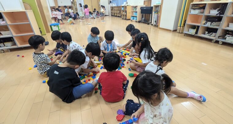 10月11日(金)幼児:3~5歳児(ほーぷるのぼり) コーナー遊びをしました。 フープ、ブロック、折り紙、玉入れ、ムカデのコーナーに分かれで過ごしました。 折り紙コーナーでは折った紙飛行機で「3,2,1、それー!」とみんなで一斉に飛ばしたり、 「どうやって折るの?」と聞いて、一緒に作ったりしました。 ムカデコーナーでは3人1組で「いくよー!赤!青!赤!青!」と息を合わせて進むことを