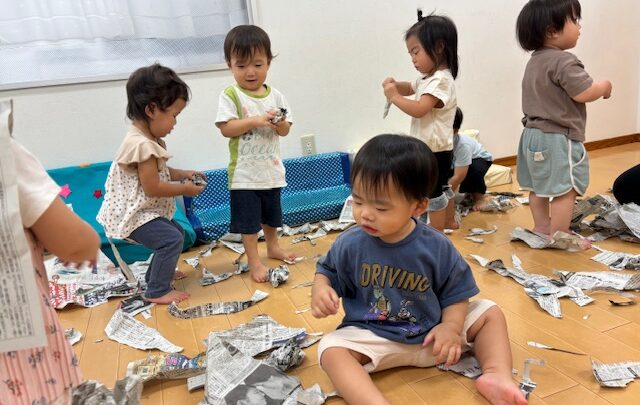 9月26日(木)1歳児:いるか組・めだか組(ほーぷるのぼり・のぼり小規模保育園) 2グループに分かれて遊びました。 新聞紙遊びでは、丸めたりちぎったり。 洋服を作ってみると、嬉しそうに歩いたりして遊びましたよ。 マリンシャトーでは、ボールプールでお友達とボールの投げ合いっこしたり、雲梯をしたりと 楽しむいるか組のお友達でしたよ。 【設定内容】