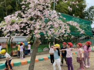 4月8日(月)幼児:うめ組(ほーぷるのぼり) 土日ですっかり満開になったチキチキ広場の桜の木を「きれい~!」と見上げていました。 その後、みんなで協力しおもちゃを出して砂遊びを楽しみましたよ。 カメもそろそろ長い冬眠から目を覚ましそうです! 【設定内容】