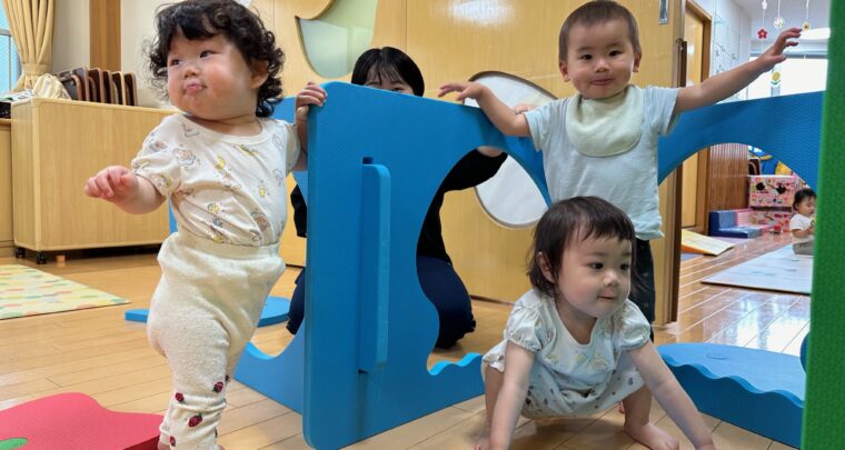 4月9日(火)0歳児:ぺんぎん組(ほーぷるのぼり) 入園して1週間がたとうとしています。少しずつ園にも慣れ、笑顔を見せてくれるようになってきました。 そんな今日は、いるか組と一緒に大型パネルで遊びました。 「ばぁー」と保育者と顔を見合わせたり、つかまり立ちをしたりして楽しんでいましたよ。 ちょっぴり眠たくなったお友達は午前睡もしています。 その後は、給食の時間です。 手づかみ食べや保育者に食べさせてもらってご機嫌さんの子どもたちでした。