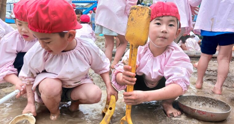 4月9日(火) 《幼児組 かっぱグループ》 昨日たくさん雨が降り、チキチキ広場の砂場には水たまりが… ということで、かっぱさん全員でどろんこ遊びをしました‼ スコップで砂を掘って、川を作ったり、泥団子を作ったり、お山を作ったりと お友達や先生たちとたくさん遊びました。 少し肌寒かったので、足湯コーナーも設けると「あったかい~、おふろみたい~‼」と大喜び! 「雨が降った次