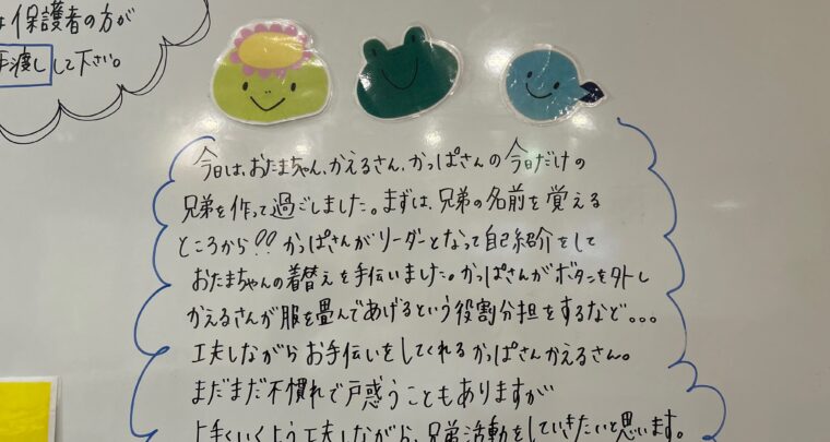 4月8日(月) 《幼児組 3組》 3兄弟で過ごしました。お帳面を一緒に貼ったり、おたまちゃんの着替えを手伝ってくれました。 「ここだよ!」と、シールを貼る場所を優しく教えてあげるかっぱさんとかえるさん! その後チキチキ広場で遊びました。 設定内容→(かっぱ・かえる・おたま)異年齢保育