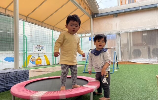 4月9日(火) 《乳児組 うさぎ組》 今日は、のぼりドームに行きました。 少し風もあったので「寒い~」と言っていた子どもたちでしたが、三輪車でレースをしたり、 アンパンマンの箱に向かってボールを投げたりしていましたよ。 ペットボトルで作ったマラカスを歌に合わせて振ったり、太鼓のようにして遊んでいるお友達もいましたよ。 設定内容→(ひよこ)戸外遊び(園周辺散歩) (こりす)室内遊び(ボール、知育玩具) (りす)室内遊