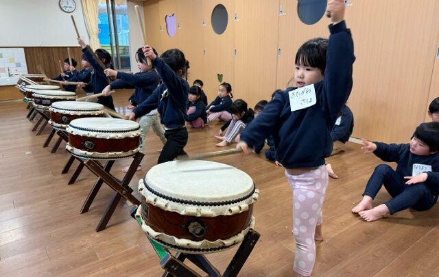 3月12日(火) 《幼児組 かえる1組》 和太鼓講師の戸田先生と一緒に和太鼓をしました。股割りや基本となるリズムから今日は ①ドンドンドンドンドドンコドン ②ドッコドッコドッコドン×4の少し難しいリズムにも挑戦しました。 叩けるようになりたい気持ちから順番を待っている間もリズム打ち練習に励むかえるさんです。 戸田先生との和太鼓は今年度最後となりましたが、かっぱさんに向けて引き続き練習をしていきたいと