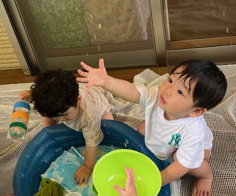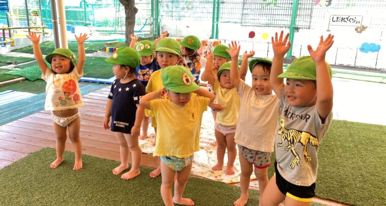 7月18日(火) 《乳児組 うさぎ組》 今日はのぼりドームで遊んだ後、水遊びをしました。 それぞれ好きな遊びを見つけて遊んだり、友達と関わることを楽しむ姿が見られましたよ。 水遊びをする前に準備体操をするうさぎ組さん。 水遊びをしている途中、保育者がシャワーを出すと「キャー!」と言って水を浴びに来たり、 「ジョウロに入れて!」「おかわり下さい!」とお願いする姿が可愛かったです❣ また、水遊びのお片付け