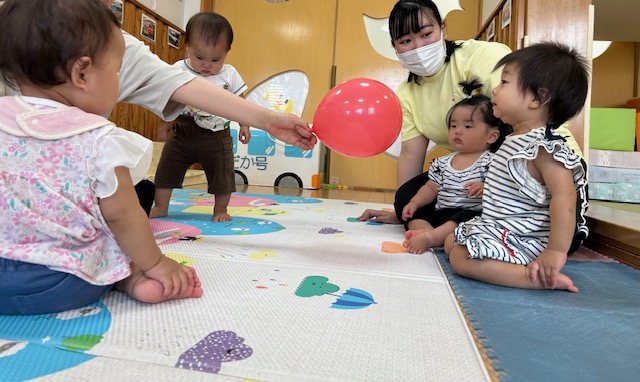 7月18日(火)0歳児:ぺんぎん組・めだか組(ほーぷるのぼり・のぼり小規模保育園) 今日は、風船遊びをしました。 保育者が、風船を膨らませるところを不思議そうにみる子どもたち。 空気を ”シュー ” と抜くと、どんどん小さくなり ”あれ?” とビックリしていましたよ。 風船を持ってフリフリとゆらしたり、ポーンと投げたりして遊ぶのでした。 【設定内容】