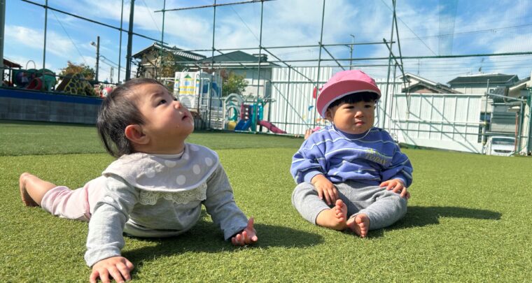10月24日(火)0歳児:ぺんぎん組・めだか組(ほーぷるのぼり・のぼり小規模保育園) 今日は、はだしっこ広場へ行きました。 『いい天気だな~』と言わんばかりに空を見上げたり、 人工芝の上でハイハイをしたり、マットの穴に座ったりして遊ぶ子どもたち。 沢山体を動かして疲れたのか、帰りのバギーの中では眠ったり、 のんびり外の景色を眺めたりしていましたよ。 【設定内容】