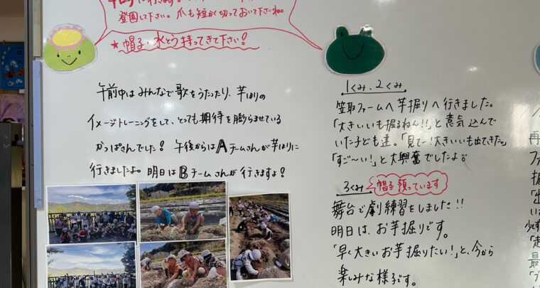 10月24日(火) 《幼児組 おたま4組》 みんなが楽しみにしていたお芋掘りがありました! 「どんなお芋やろな~」と、とっても楽しみな様子のおたまちゃん。 「どうやって掘るの?」と聞くと「ショベルカーみたいに(指を曲げて)掘るよー!」 「掘れてきたらグラグラ揺らすんやでー」と予習はバッチリです! そして、いざ本番‼土と格闘しながら目をキラキラさせて掘り進めるおたまちゃんでした