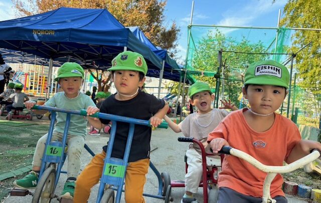 10月24日(火) 《乳児組 きりん組》 とっても気持ちの良い季節になり、元気いっぱいのきりん組のお友達はチキチキ広場に行って遊びました。 大好きな三輪車に乗り、砂場の周りを走ったり 「ドングリあるかな~?」と探し、見つけるとお皿やバケツに集めていました。 保育室に戻る時に幼児組さんが掘った大きなお芋を見せてもらい「おっき~!!」と 興味津々で見ていた子どもたちでした! 今日も思い思いに楽しむことができましたɶ