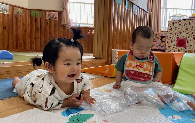 7月4日(火)0歳児:ぺんぎん組・めだか組(ほーぷるのぼり・のぼり小規模保育園) 今日は、水の感触遊びをしました。 袋に水を入れたものをツンツンと触ってみたり、ペンペンと叩いてみたりして楽しむ子どもたち。 初めての感触に驚くお友達もいましたが、 慣れてくると、”何だろう?” と不思議そうに手を伸ばしていましたよ。 【設定内容】
