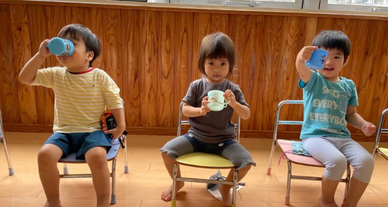 7月5日(水)2歳児:あしか組(ほーぷるのぼり) 今日から 園のコップではなく 自分のコップを使い始めました。 給食袋を開けようとすると、「できない~」と苦戦する子どもたち。 保育者に教わりながら 給食袋を開けると 「みて!」とコップを見せてくれましたよ。 自分のコップでお茶を飲むことが嬉しくて ニコニコ笑顔の子どもたちでしたよ。 【設定内容】