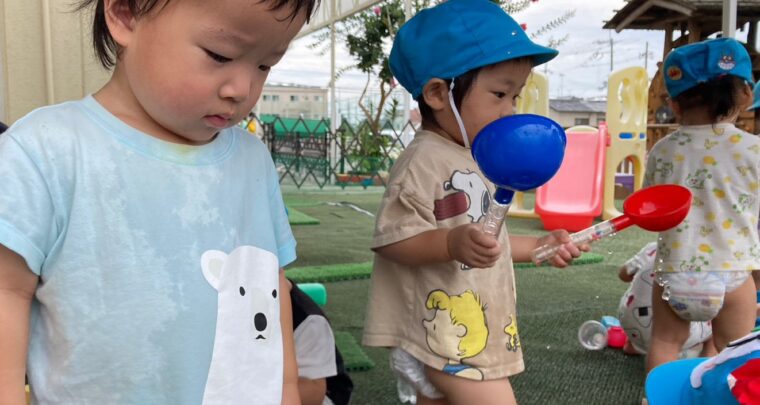 7月5日(水) 《乳児組 あひる組》 待ちに待った水遊びをしました。ほっと広場に行くといつもと違い、水遊びのおもちゃが 置いてあるのを見て、笑顔になる子ども達。 じょうろで水をかけたり、カップで水をすくってみたりして楽しんでいました。 水が入っているタライの中に入って遊ぶお友達もいましたよ。 みんな顔に水がかかっても嫌がることなく初めての水遊びを満喫していました❣ 設定内容→(ぴっころ)室内遊び(ア