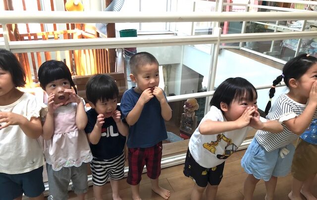 7月4日(火) 《幼児組 おたま3組》 今日は、パパイヤダンス教室に参加した後、モンキーシャトーで遊びました。 さきに遊んでいたかっぱさんにみんなで「いれて~」と聞くと「いいよ!」との返事をもらい 「ヤッター!!」と大喜びの子ども達。 お兄さん、お姉さんと一緒に楽しく遊びました。すべり台の下をお店屋さんにしてごっこ遊びを したり、鉄棒に挑戦するお友達もいました。 そしてモンキーシャトーの隣に飾っている七夕飾
