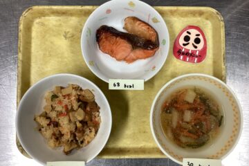 鶏肉の生姜焼き・ほうれん草の磯和え・しめじの野菜スープ 今日の給食はご飯と鶏肉の生姜焼きとほうれん草の磯和えとしめじの野菜スープです。 ほうれん草の磯和えは野菜にきざみのりとしょうゆを和えています。とても美味しかったですよ。