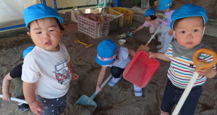5月11日(木)1歳児:いるか組(ほーぷるのぼり) はしりっこ広場で遊びました。 みんなの背丈ほどあるシャベルを持ち、砂をすくったり、ブランコに乗ったり… シートの上で休憩するお友達もいましたよ。 広場には、コップブラシのような珍しい植物があり、興味深く観察する姿が見られました。 室内遊びでは、なぐり描きをしましたよ。 【設定内容】