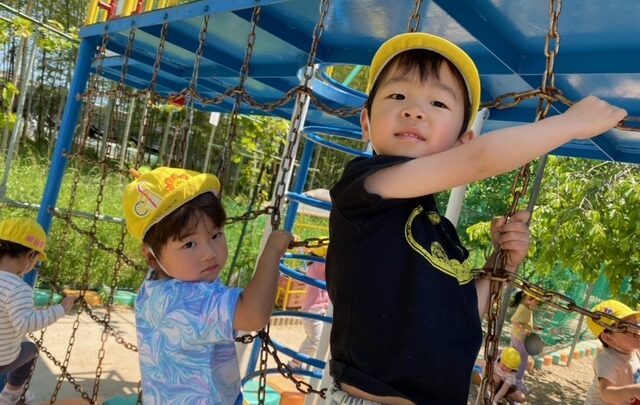 5月11日(木) 《幼児組 おたま2組》 今日はチキチキ広場で遊びました。 総合遊具の鎖を登ることに挑戦してみたり、 滑り台が大好きなおたま2組さんは、何回もすべり台を滑ったりと楽しんでいましたよ。 砂場では、スコップを使って穴を掘ってみたり、おままごとをしたりと好きな遊びを見つけて 遊ぶおたまちゃんでした。 設定内容→(かっぱ)体操 (かえる)リレー(やん茶広場) (おたま)1,2組チキチ