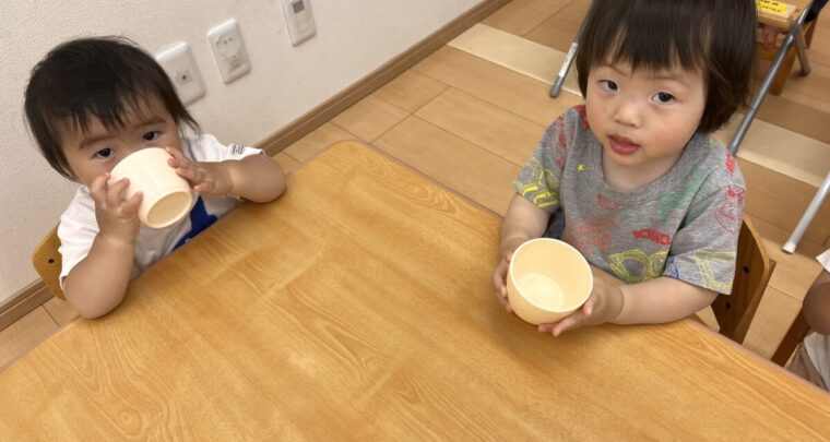 5月10日(水) 《乳児組 りす組》 今回はりす組の日中の様子をご紹介します。 まずは、椅子に座って手をきれいにした後お茶を飲みます。とても暑かったので何度も “ちょうだい”とアピールしてお代わりをしていました。 お茶の後は2つのグループ分かれてはしりっこ広場、サブルーム2Fへ遊びに行きました。 はしりっこ広場へ行くお友達は、自分で帽子をかぶったり、靴下を履こうとしたり準備を頑張っていました。 サブルーム2Fでは、サーキ