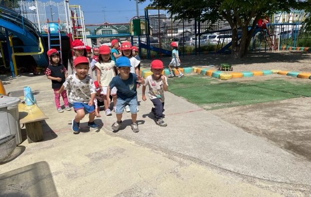 5月10日(水) 《幼児組 かえる3組》 かけっこが好きなかえる3組さん。今日は、みんなでチキチキ広場を3本ダッシュ‼ 「ヨーイ、ピッ!」の合図で走り出します。 「途中で抜かして走った」「1番やったでー」と、ゴールをすると嬉しそうにお話をしてくれる 子ども達。競争心も芽生え“1番になりたい”“負けたくない”と言う気持ちも持ちながら走っていましたよ。 その後、チキチキ広場でたくさん遊びました。