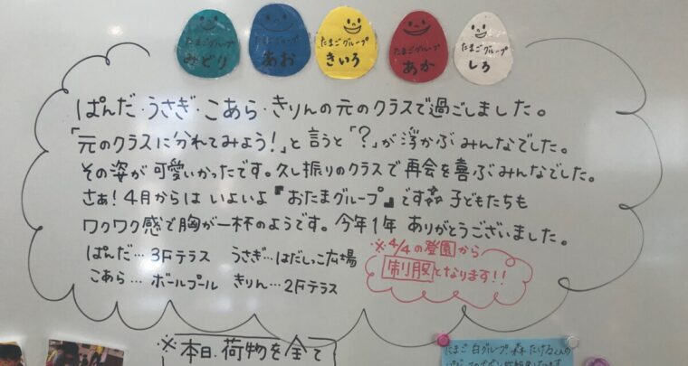 3月31日(金) 《幼児組 おたま3組》 今年度も今日で終わりとなりました。 あっという間の1年でしたが、日々子ども達の成長を見守ることができ、職員一同嬉しく思います。 そんな最終日の今日は、チキチキ広場で思いっきり遊び、最後のクラスでの思い出を作りました。 次、みんなが登園する時は1つお兄ちゃん、お姉ちゃん‼楽しみにしています。 かっぱさん、小学校へ行っても頑張ってね! 設定内