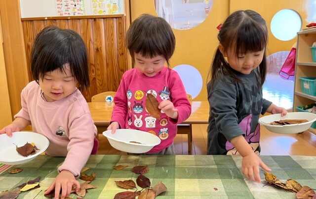 11月18日(金) 《乳児組 ひよこ組》 チキチキ広場の落ち葉が赤や黄、オレンジへと姿を変えて戸外遊びが一段と楽しい季節になりました。 今日は、以前園庭で拾ったどんぐりを使って落ち葉製作をしましたよ。 “どんな風にするのかな~?”と興味を持って見つめる子ども達・・・。 どんぐりをケースの中に入れて、転がっていく様子を見たり・・・ 振って転がすことを楽しんでいましたよ。 出来上がると喜んでいましたよ!、また、玄関に飾る