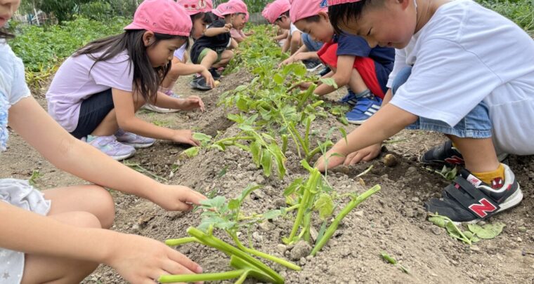 6月20日(月)5歳児:かっぱグループ(ほーぷるのぼり) ファームでじゃがいもの収穫をしました。 「去年、みんなが植えたじゃがいもだよ」と教えてもらい「え~!!」と こんなに大きく成長したことに驚きの子どもたちでした。 いざ手で掘り始めると虫がでてきて手が止まるお友達や、 「みみず いたよー」とつまんで見せるお友達など様々な様子がありました。 どんどん堀すすめていくと、たくさんのじゃがいもが!!両手で持ちきれない量でしたよ。 「また、給