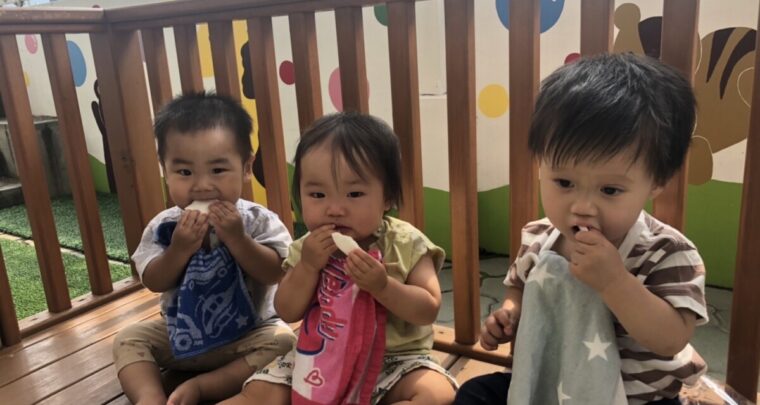 6月17日(金) 《乳児組 ひよこ組》 風が吹き抜けるキッズテラスはひよこ組お気に入りの場所です。 天気が良かったので、テラスで朝のおやつタイム♡ちょっとしたピクニック気分でした。 その後はそのままテラス横で製作タイムです。紙皿に花紙でかたつむりの模様をつけて楽しみました。 また、園周辺を散策し「えいえいおー!」と掛け声をすると腕を動かして「おー!」と反応する姿も 見せてくれました。晴れた日は外で過ごすことが大好きな