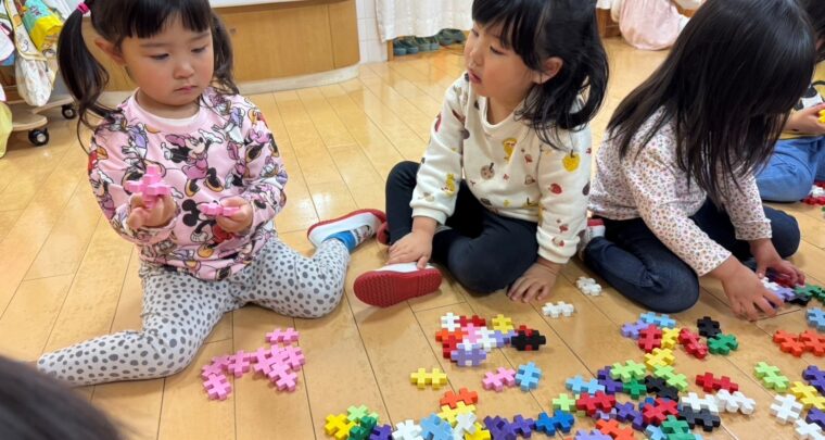 3月11日(火)2歳児:ぶどう組(ほーぷるのぼり) あしか組のお友達と一緒に遊びました。 最初は、ぶどうちゃんとあしかちゃんで分かれていることが多かったですが、少しずつ交流している姿が見られるようになってきましたよ。 朝の会では、みんな大きな口を開けて歌をうたっているんでした。 【設定内容】 【ほのぼの設定内容】