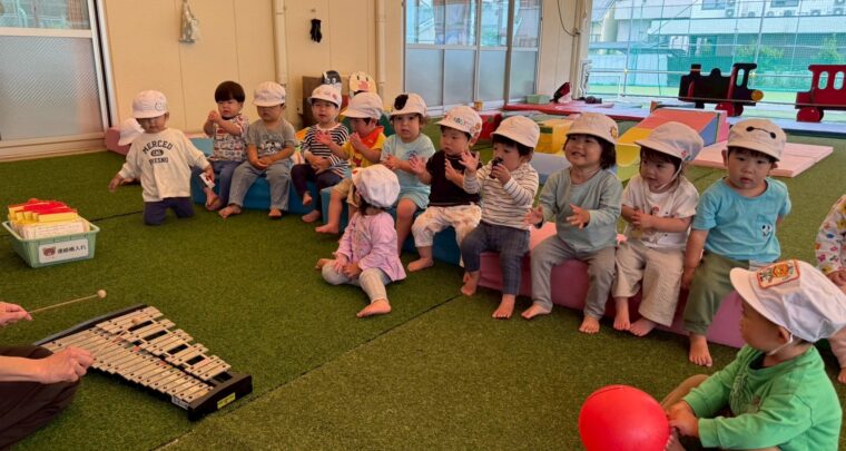 5月12日(月) 《乳児組 こぐま組》 こぐま組の朝の会の様子です。 保育者の周りに集まり「とんとんとんとん、アンパンマン」「春ですね」「ちっちゃないちご」など、 鉄琴の音色に合わせて、元気いっぱいにたくさん歌いました! 朝の会の後は、お茶を飲みました。コップを両手を持ってこぼさずに上手に飲めるようになってきました! ほっと広場では、動物のロッキングに乗ったり、水車の前から園バスを見たりして楽しく過ごしましたよ❣ 設定内容→(ひ