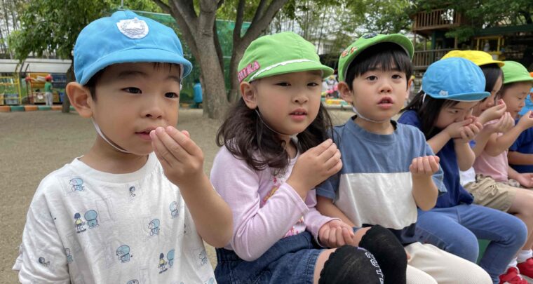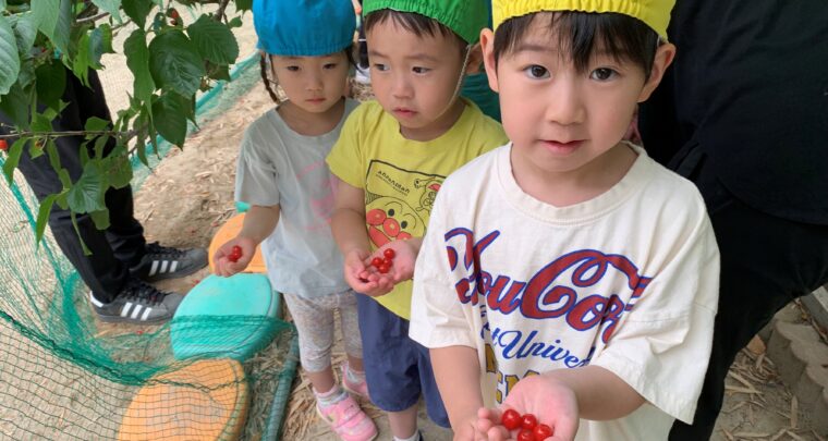 5月9日(金)幼児:うめ組(ほーぷるのぼり) チキチキ広場にあるさくらんぼを収穫し、食べに行きました、 「どんな味かな」「美味しそ~!!」と収穫前から ソワソワしていた子どもたち。 「4つ採ってもいいですよ」と伝えられると、真剣な顔で真っ赤なさくらんぼを探していましたよ! みんなで食べると、顔を見合わせ「おいし~!」と笑顔溢れるうめ組さんなのでした。