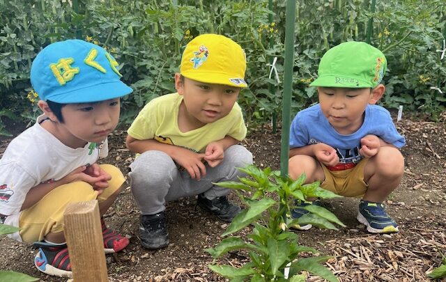 5月12日(月) 《幼児組 ゆり組》 ファームへ行ってかっぱさんの育てている野菜の観察に行きました。 かっぱさんは兄弟のおたまちゃん、かえるさんに自分の野菜を「これだよ」と教えてくれ「花が咲いてる!」と 苗の成長を喜ぶ子どもたちでした。 さくらんぼも収穫しました。 設定内容→ ファームのぼり