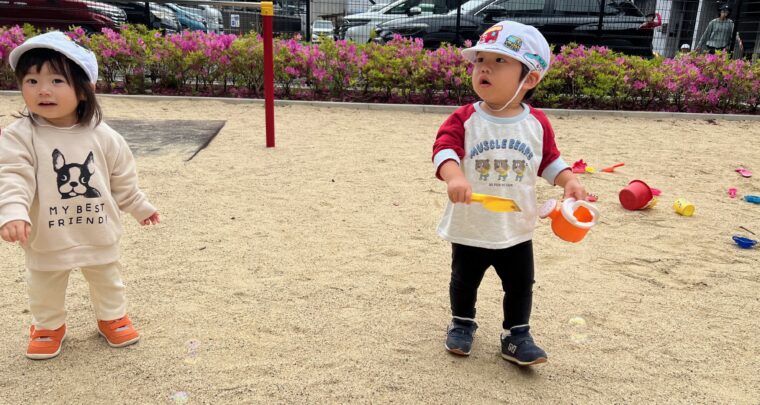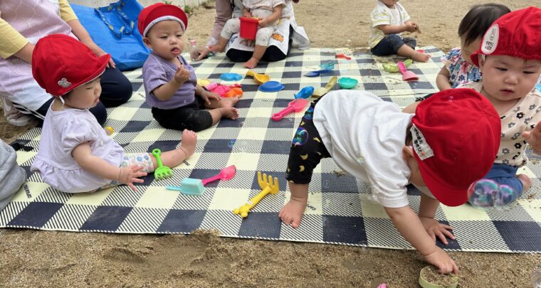 5月12日(月) 0歳児:みかん・ばなな組 (ほのぼの) 奈良町南遊園で遊びました。 前日の雨で湿った砂の感触が楽しい子どもたち。にぎにぎ、トントンしたり、 ハイハイしてシャボン玉を追いかけたりと、全身を使って遊んでいましたよ。 ~おまけ~ たくさん遊んでたくさん離乳食を食べて…スヤスヤ夢の中の子どもたちです。 【設定内容】 みかん・ばなな組:戸外遊び(奈良町南