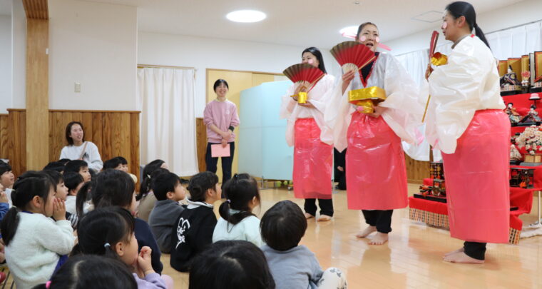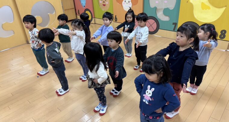 3月4日(火)2歳児:ぶどう組(ほーぷるのぼり) ステップアップし3週間が経とうとしています。今日は、朝の会の様子をお届けします‼ ” 前にならえ ”の合図で整列をしピアノの音を聞き、肩幅に足を開いて歌の姿勢をつくります。 まるで幼児組のお兄さん、お姉さんのようですね‼ 3月に入り、春のうたも歌っていますよ。チューリップやひなまつりなど… 歌うことが大好きな子どもたちは「〇〇歌いたい!」とリクエストが