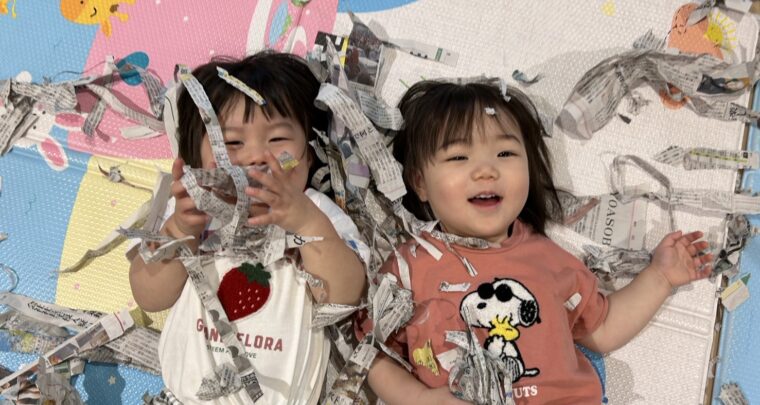 3月5日(水)0・1歳児(ほのぼの) 今週は雨の日が続いていますが、今日も元気いっぱいに登園してくれた子どもたち。 りんご組・みかん組・ぺんぎん組全員で、コーナー遊びをしました。 新聞紙を細かくちぎったり投げたりして新聞紙遊びをしたり、 手押し車を勢いよく走らせたりと、体をたくさん動かして遊んでいました。 また、パスでのお絵描きやシール貼りにも夢中になっていましたよ