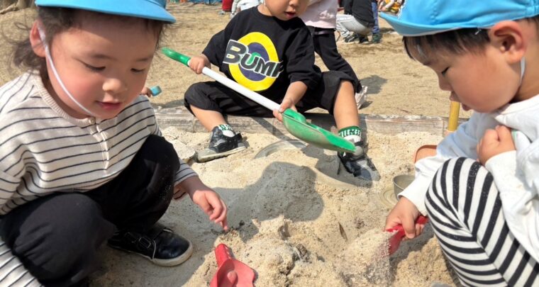3月27日(木) 《乳児組 たまご赤グループ》 散策をしてから、2歳全員でチキチキ広場で遊びました。 新しくできた砂場で遊べることに「やったー!」と喜ぶ子どもたち。さらさらな白い砂を触り 「つめた~い!」と感触を楽しむ子もいれば、友達と一緒にままごとを楽しむ子どもたちもいましたよ。 違うグループの友達と遊べてとても嬉しそうなたまごちゃんでした。 設定内容→(ひよこ)こっこ・ぴよぴよ…戸外遊び(ほっと広場) (1歳) ぶどう…戸外