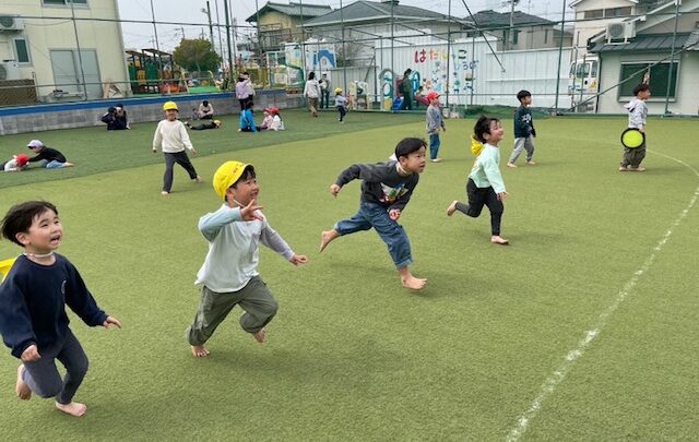 3月24日(月)幼児:2~5歳児(ほーぷるのぼり) 2~5歳児のみんなではだしっこ広場で遊びました。 暖かくなり、靴、くつ下をぬいで駆けまわり「気持ちいい~」と心地良さそうでした。 フリスビーを投げては つかむことを競争したり、ゴロゴロしてみたり異年齢のお友達と話すことを楽しんだり… また、支援センターを利用されている方にも「こんにちは」「かわいい~」「一緒に遊ぼう」と話しかけ、交